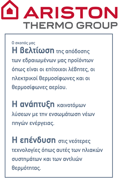 Περισσότερα από 250 άτοµα απασχολούνται στην Έρευνα & Τεχνολογία. Ο σκόπος είναι η ανάπτυξη προϊόντων και πιο δοµηµένων λύσεων µε µεγαλύτερη άνεση, µικρότερη κατανάλωση ενέργειας, χαµηλότερους ρύπους. Οι ανανεώσιµες πηγές παίζουν µεγάλο ρόλο καθώς είναι πηγές ενέργειας µε µηδενικές εκποµπές ρύπων. Ο όµιλος Ariston Thermo επενδύει πάντα περισσότερα χρήµατα στη µελέτη των ηλιακών συστηµάτων, των αντλιών θερµότητας και των στοιχείων καυσίµων για την συµπαραγωγή θερµότητας και ηλεκτρισµού.